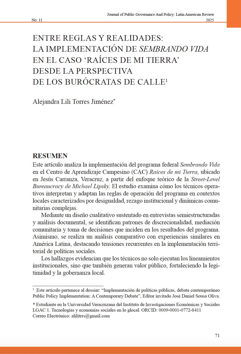 Este artículo analiza la implementación del programa federal Sembrando Vida en el Centro de Aprendizaje Campesino (CAC) Raíces de mi Tierra, ubicado en Jesús Carranza, Veracruz, a partir del enfoque teórico de la Street-Level Bureaucracy de Michael Lipsky. El estudio examina cómo los técnicos operativos interpretan y adaptan las reglas de operación del programa en contextos locales caracterizados por desigualdad, rezago institucional y dinámicas comunitarias complejas. Mediante un diseño cualitativo sustentado en entrevistas semiestructuradas y análisis documental, se identifican patrones de discrecionalidad, mediación comunitaria y toma de decisiones que inciden en los resultados del programa. Asimismo, se realiza un análisis comparativo con experiencias similares en América Latina, destacando tensiones recurrentes en la implementación territorial de políticas sociales. Los hallazgos evidencian que los técnicos no solo ejecutan los lineamientos institucionales, sino que también generan valor público, fortaleciendo la legitimidad y la gobernanza local.